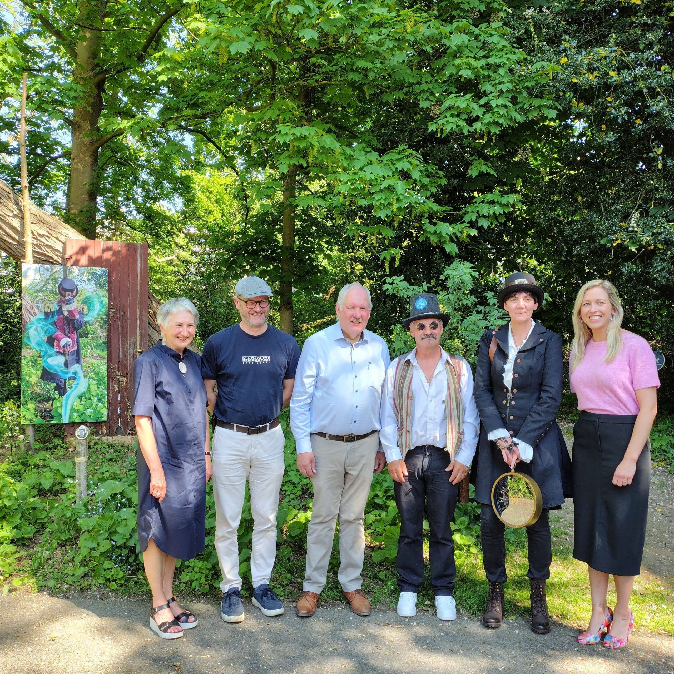 vlnr curator Gerda Drieghe, schepen van cultuur Dimitri Van Laere, burgemeester Marc Van de Vijver, kunstenaars Paul De Wachter en Hilde De Loor en directeur Krisje Van Doninck